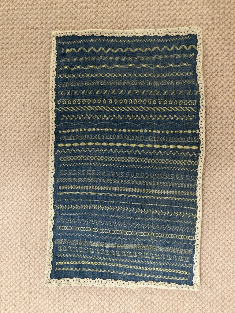 Most are upcycled from last year’s received cards with the rest made with long held supplies. In this case cross stitch fabric. The goal is to use what I have!