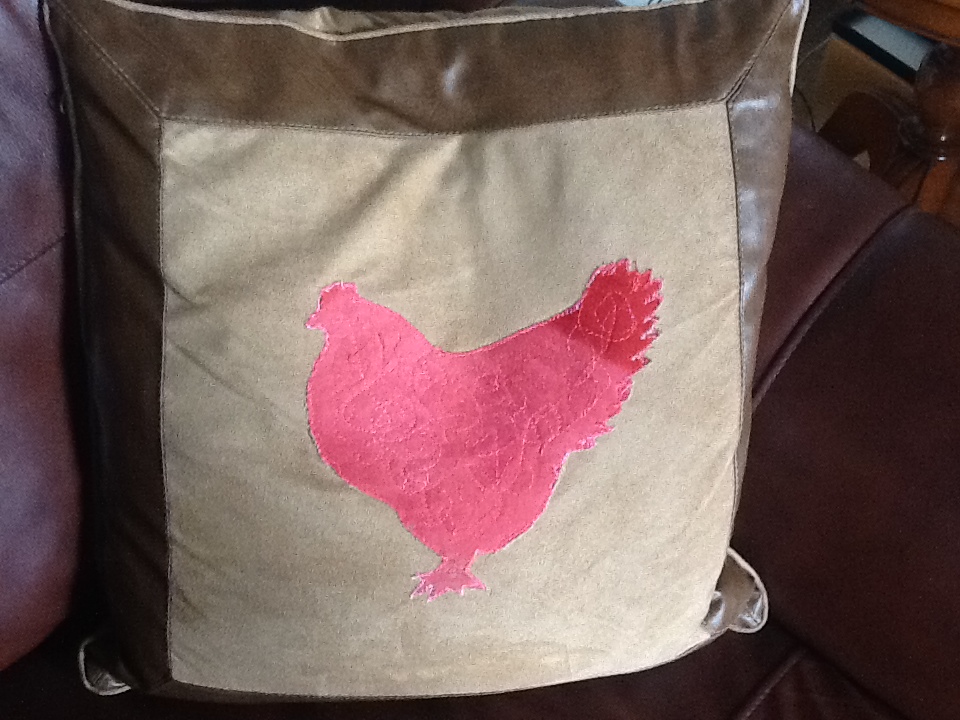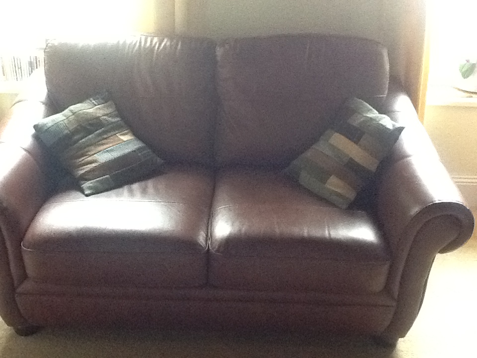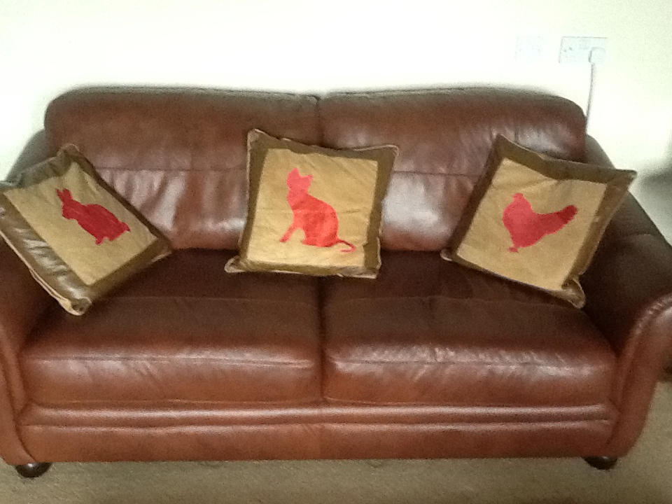 four upcycled cushions. The leather/suede/zip plain cover was from SAILS and at only £2.50 each I couldn’t have made them as well or as cheaply.