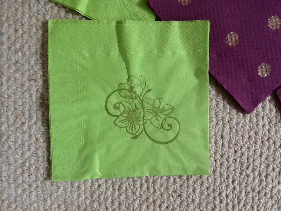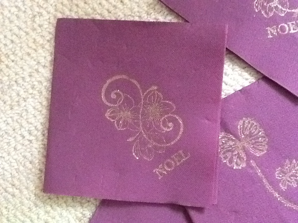 How to: Line up three napkins at a time on a firm surface, apply versamark watermark glue (comes in a stamp pad or pen) to your chosen stamp then stamp on the napkins. Sprinkle with embossing powder, then return the excess powder to the pot before using a heat gun to ‘turn’ the powder to its embossed effect. That’s it. You’re done.