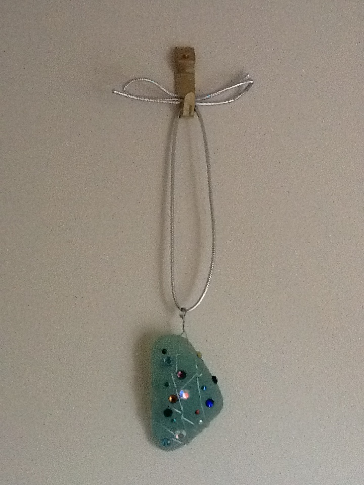 wire wrap a piece of sea glass, hot fix stones for extra bling and we have a set of tree baubles …
