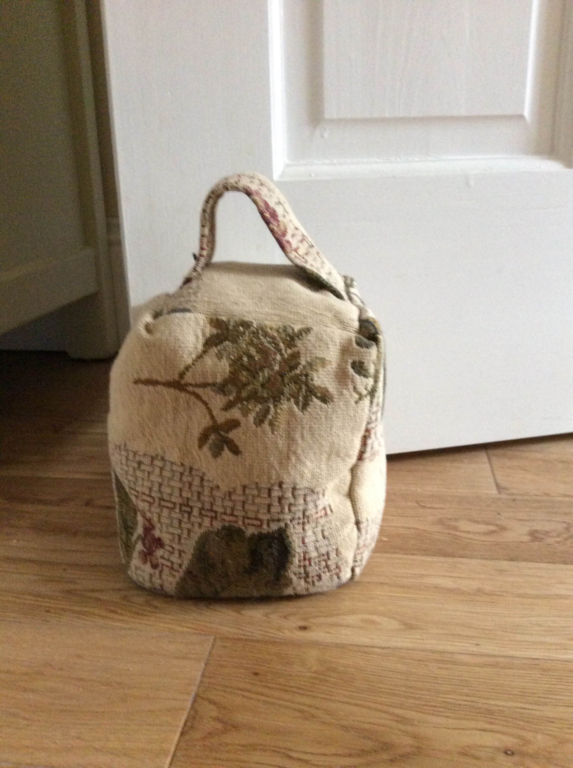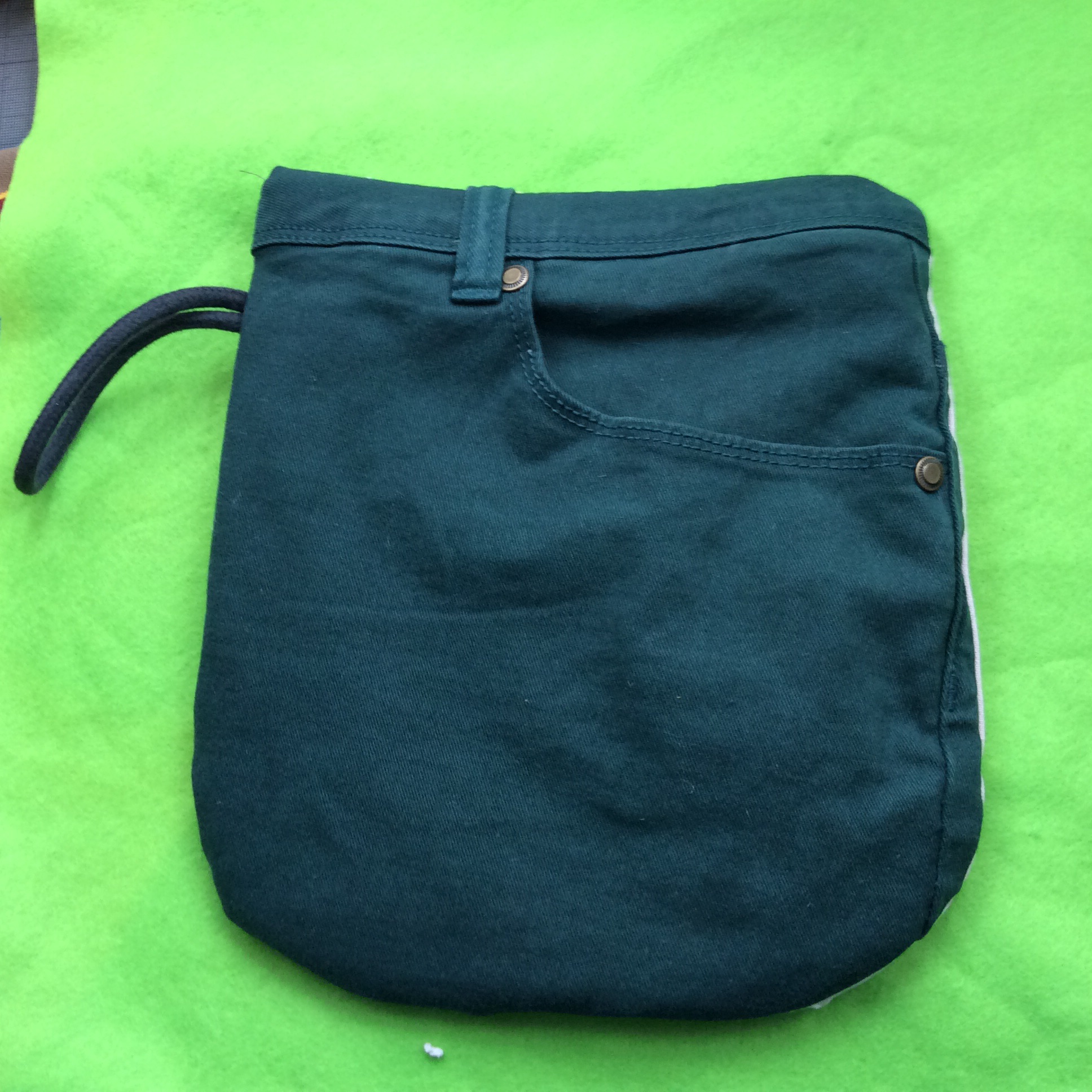 The pocket of some neglected jeans (remember, don’t buy bargain jeans any more) is simply layered face up a piece of canvas face down then insulbright and felt – I didn’t have any batting to hand. I tucked in a loop of cord for hanging – and sewed around using my walking foot, leaving a gap for turning.