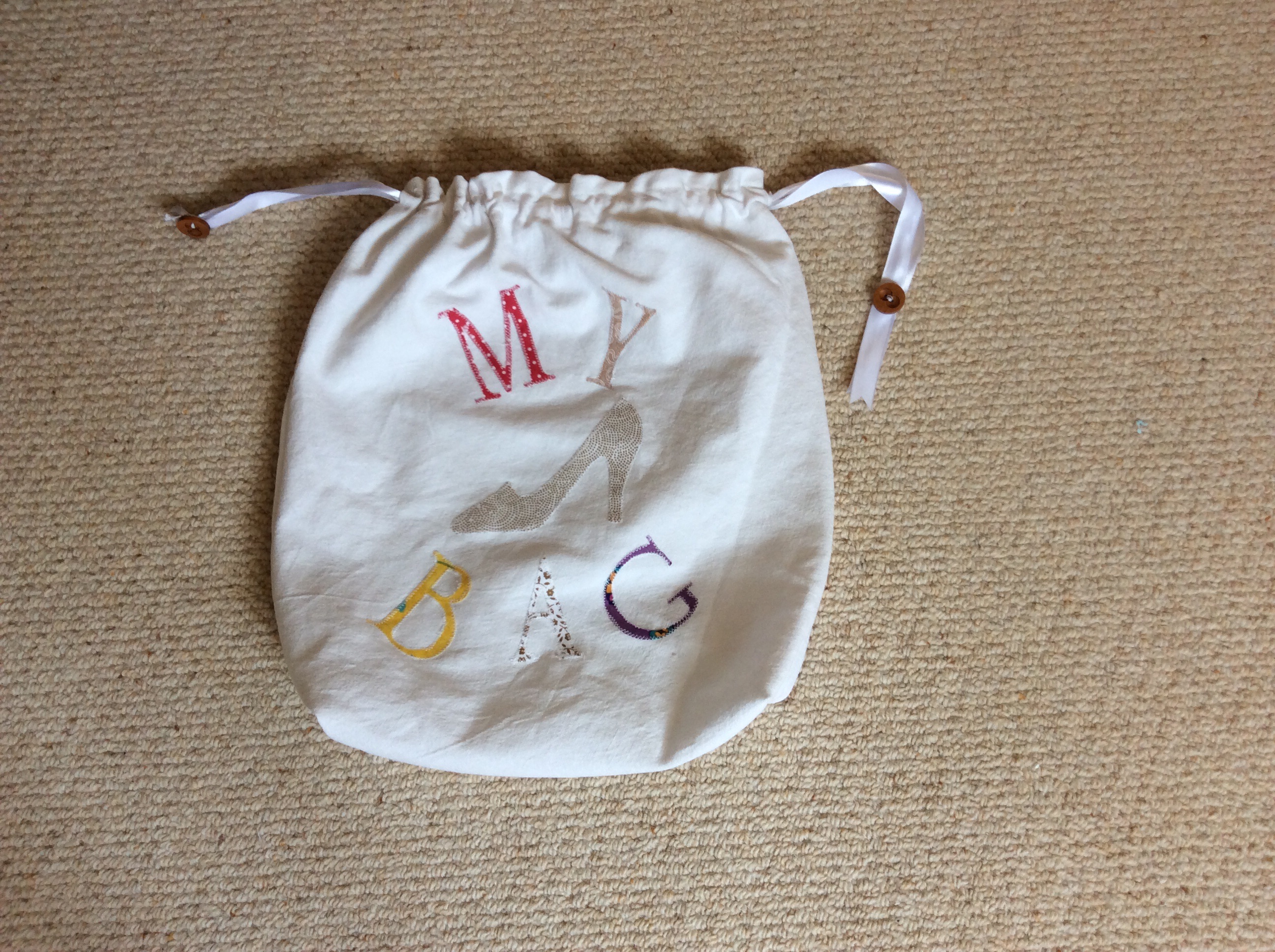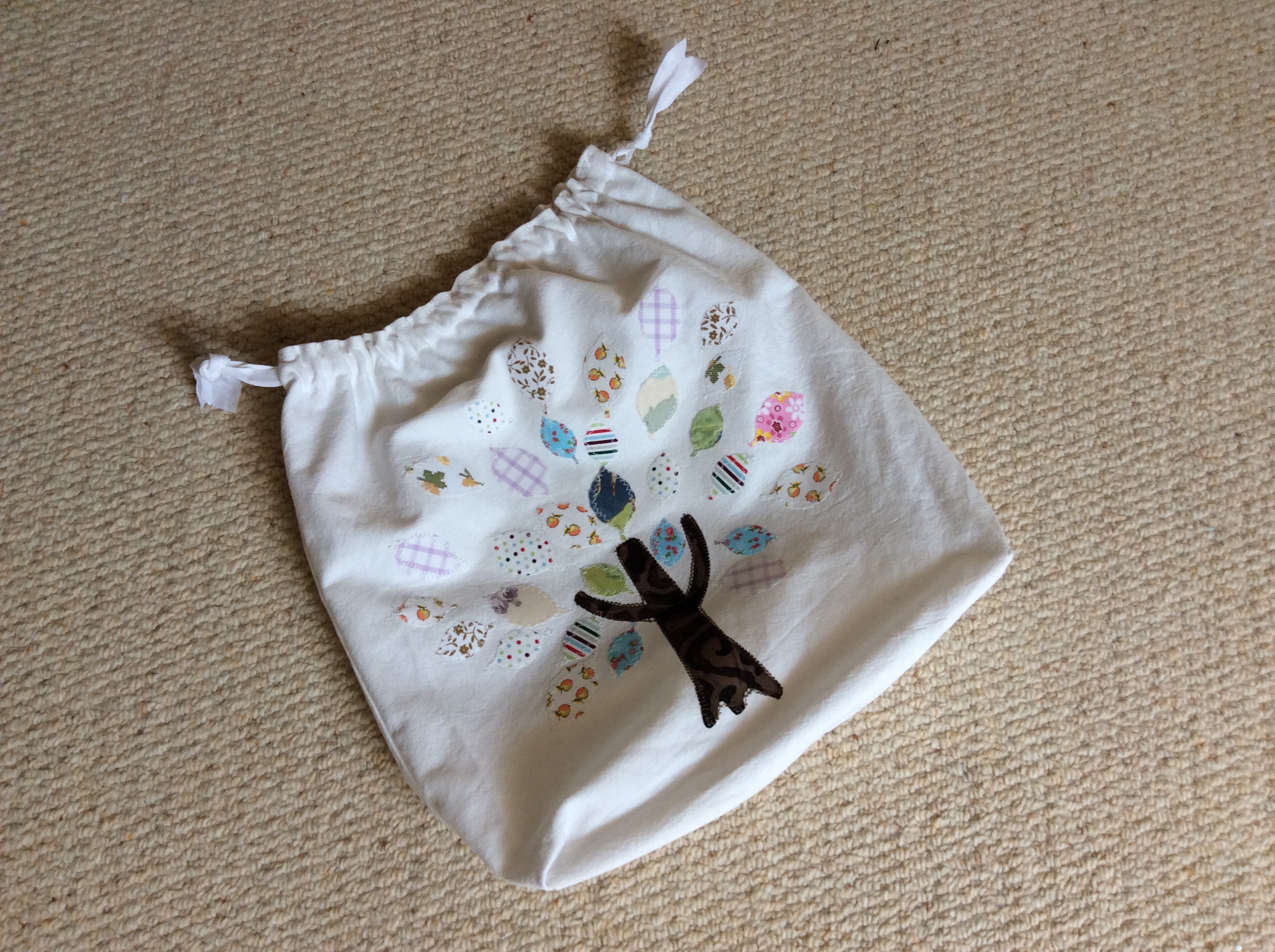 An old tablecloth up cycled into a shoe bag and a something else drawstring bag with appliqué decoration.