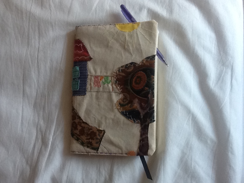take a quality corporate notebook and personalise it with a piece of beginner’s applique that I didn’t want to throw away…