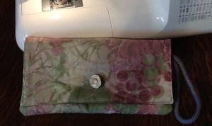 I cut two 11″ squares of the floral fabric and one of a plain lining material. I cut a matching square of wadding which I free motion quilted to the back of one of my floral squares and a half square piece ( 11 x 5 1/2″) which I quilted to half of my other floral piece. I had a 15″ piece of cord for the wrislet and a spare button for embellishment. Vintage brooches would be perfect for this sort of bag embellishment.