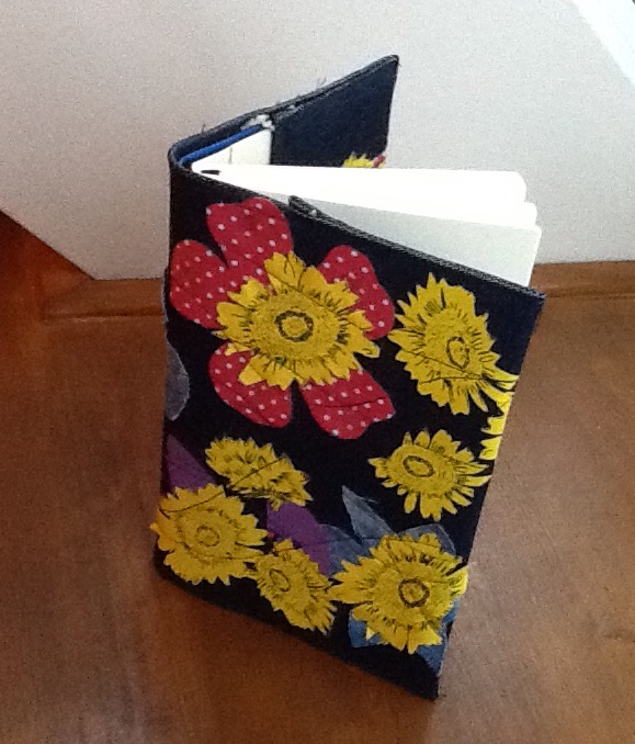 I hemmed the denim so that the height of the fabric matched the book but the width was about six inches wider than the book when opened flat. I then folded matching ends around the cover to make tight fitting flaps. These were slowly top stitched, top and bottom, quite a few layers of denim now, then the book was bent back on itself to slide into place.