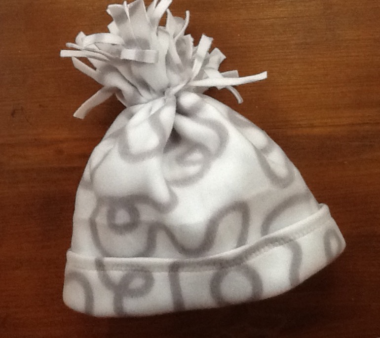 gather the fringe in a bunch in your hand as though about to form it in a pony tail and tie a thin off cut of fleece around the bunch. Trim the off cut so it blends into the bunch