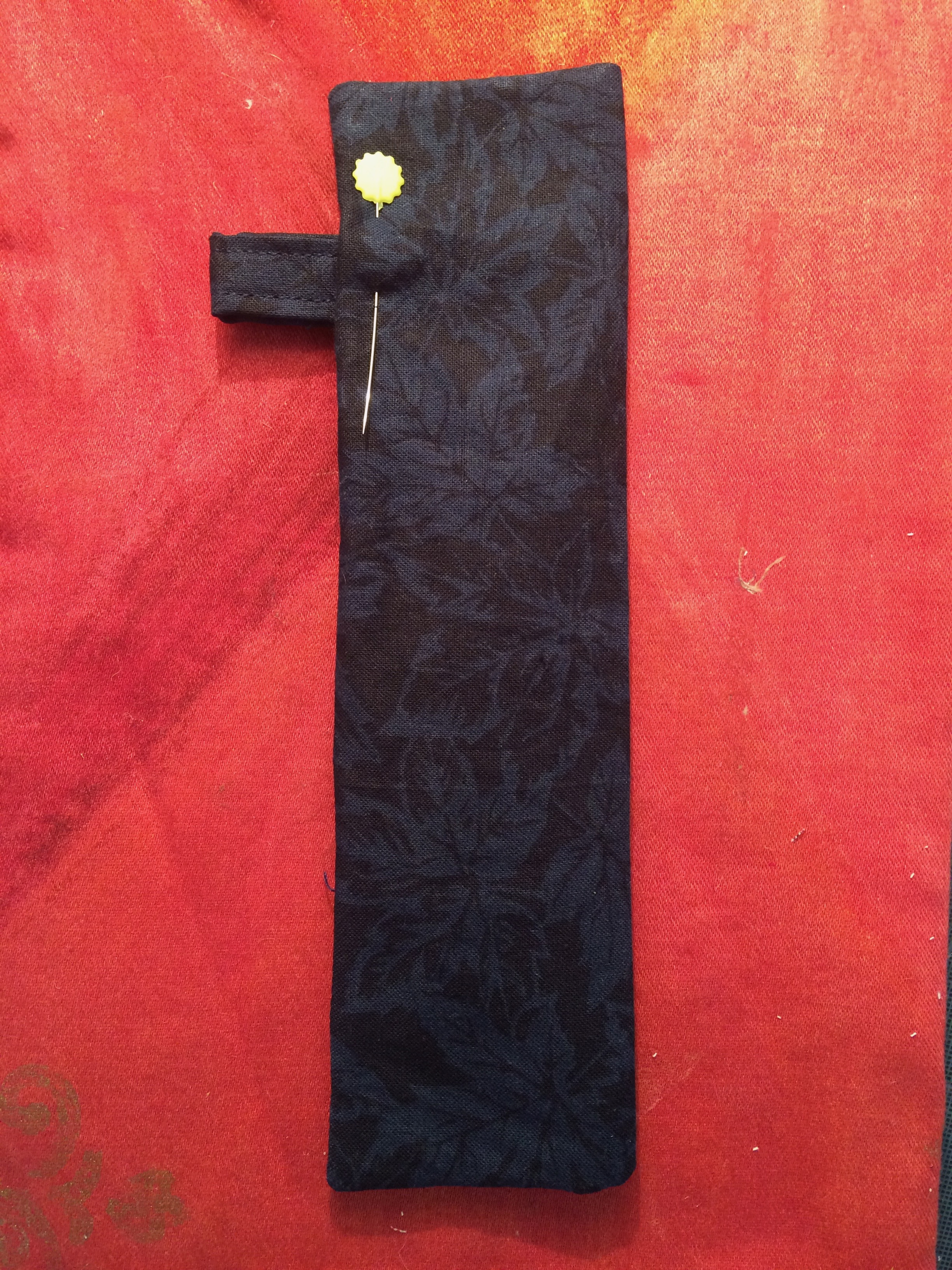All you need is a piece of fabric that is 5″ x 9″ plus a 2″ square for a tab that will slide on your key ring. If your fabric is lightweight cotton interface the main piece then fold it in half (right sides facing and iron it so you have a piece that is 2.5″ x 9″.