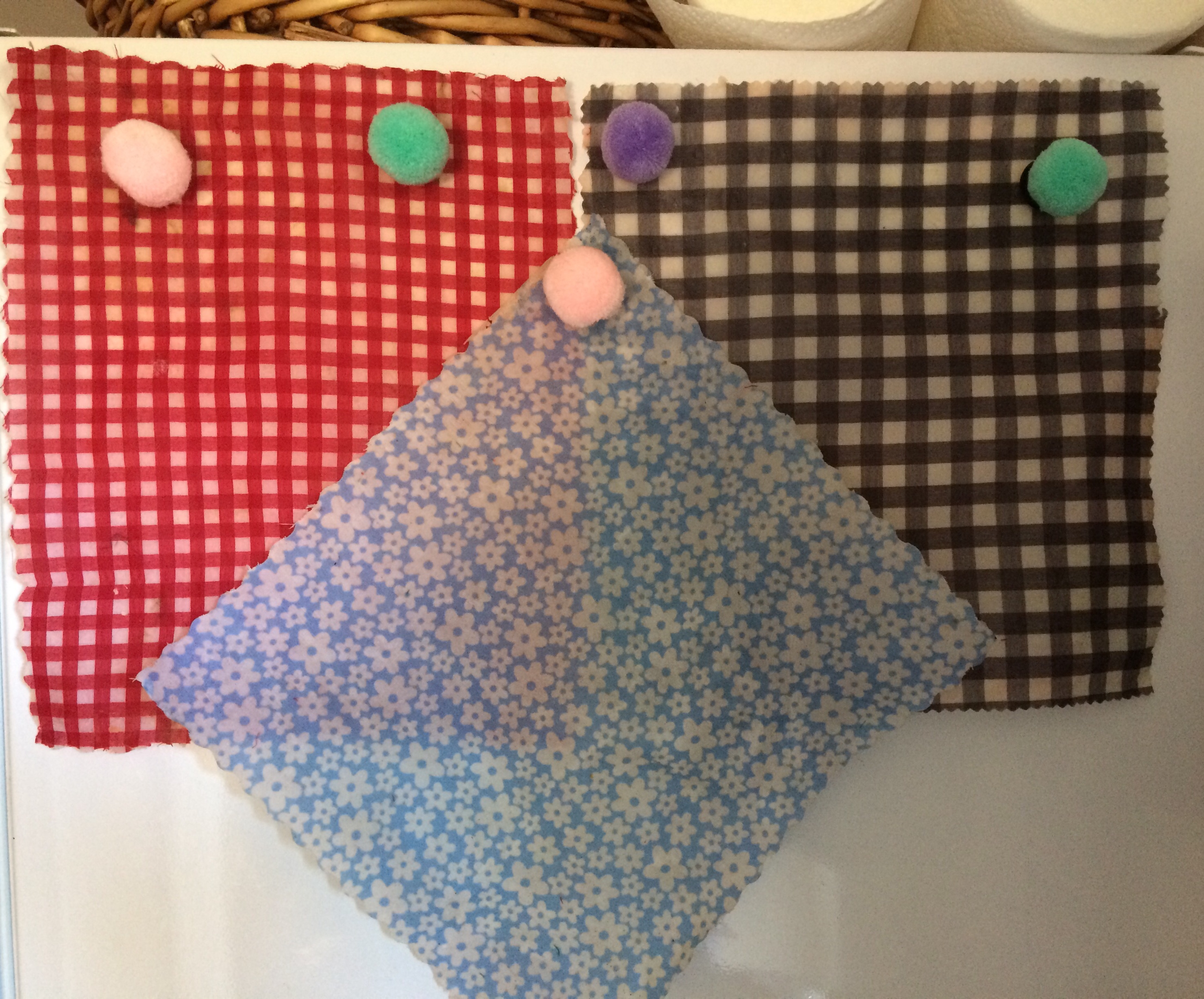Today I ‘re-waxed’ some of my older fabric squares to renovate and extend their life. It is more efficient than starting from scratch, even after months of use the fabrics still hold quite a lot of the original wax.