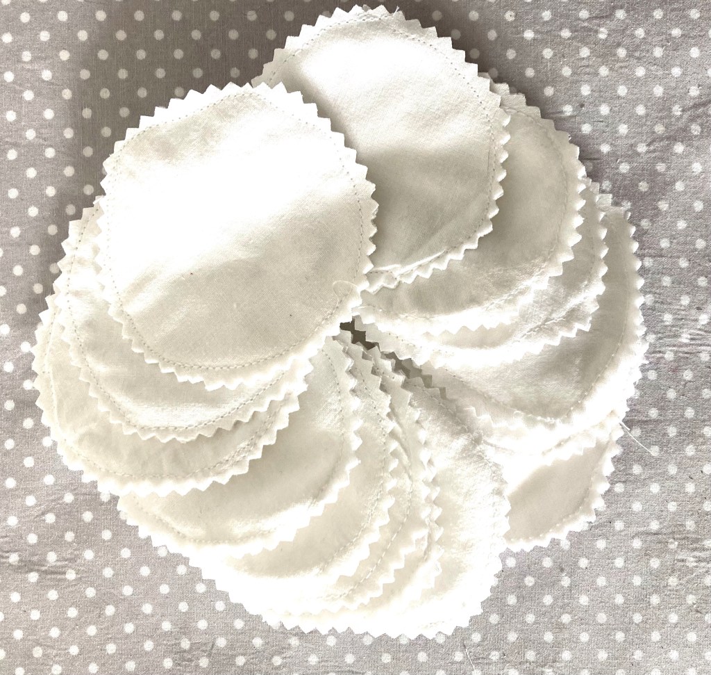 Part of a polo shirt, stained beyond use, was sandwiched between two layers of old cotton sheeting to create a new supply of reusable face wipes.