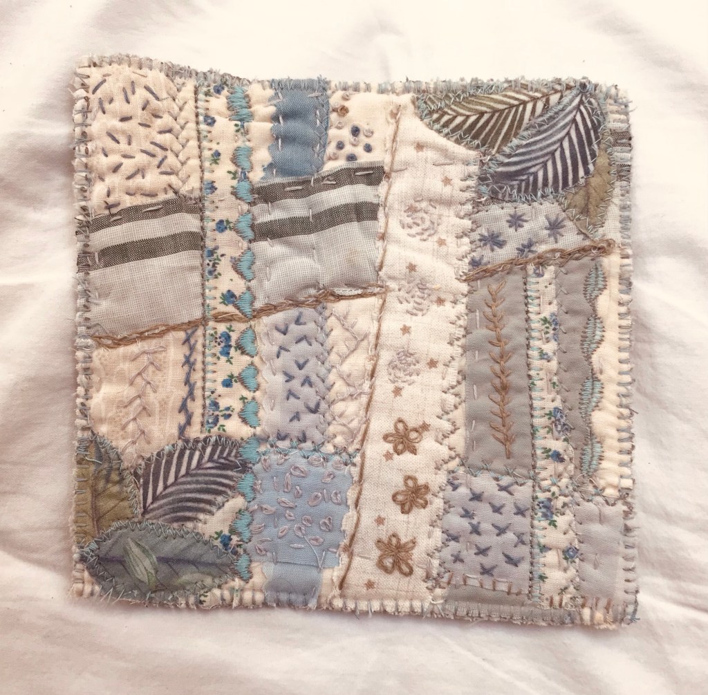 I then lost patience with the number of unfinished projects hanging around and embroidered some large scale ditzy flowers instead, added some slow stitch and fabric paint detail and turned it into a small pillow instead.