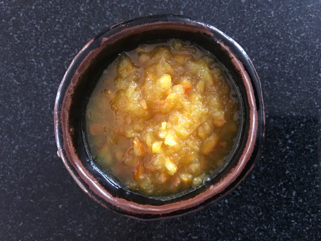 The peels are then covered with just enough fresh water and a similar volume of sugar is added. This mixture is simmered until the water evaporates, about 40 minutes for me.