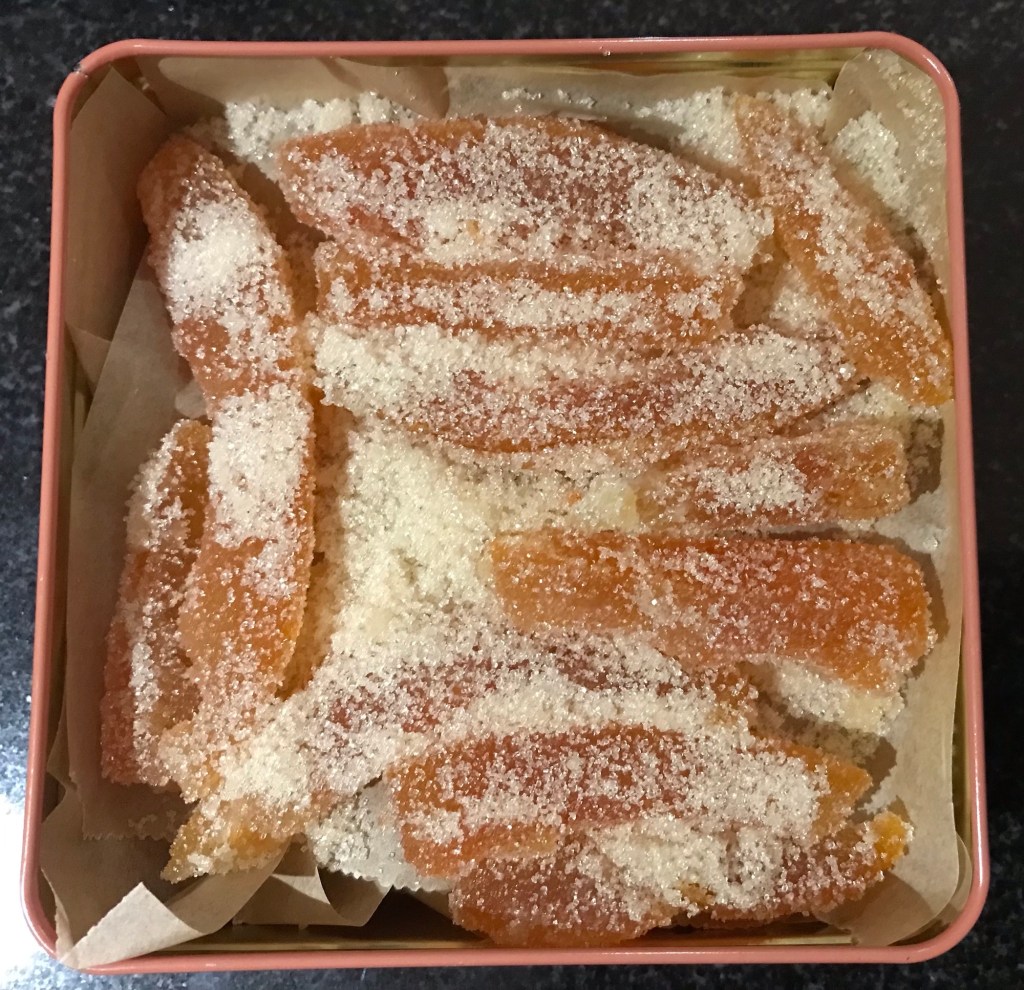 The sticky peels are then tossed in sugar and left to dry before storing in a tin.