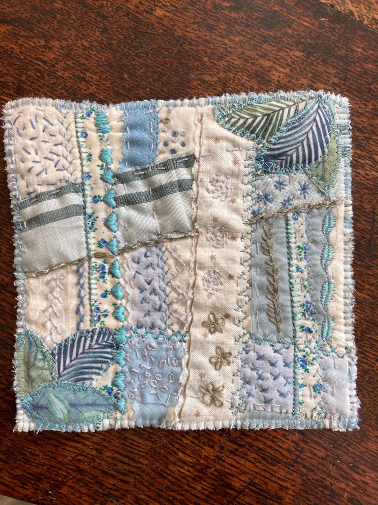 A good practice of embroidery stitches and a little using up of the fabric and ribbon mountain though.