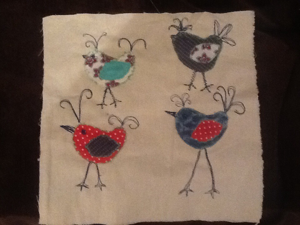 Jane’s quick-craft* technique is to trace cartoon style shapes on freezer paper, iron these shapes onto the base fabric then fix these appliqué bodies by free motion straight or zig zag stitchery around also creating legs, stalks or plumes at the same time.