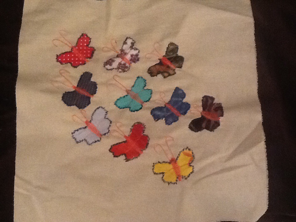 Cut felt shapes for wings and sew in position on outer of both squares – remember to mirror the wing positions..