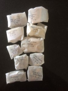 Herb butters are a bit messy but quite fulfilling. just mash the leaves of chosen herbs (remove stalks and snip down bigger leaves like sage or chives) into softened butter – I added lemon juice or garlic to my combinations. Wrap pats of herby butter in cling film or empty butter packets then greaseproof paper on which the contents are clearly written before freezing